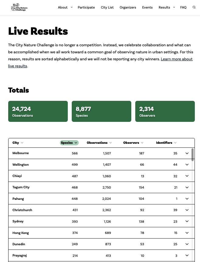 So #CityNatureChallenge2026 is live! Good to see a number of Asian Cities in Malaysia, Taiwan and Hong Kong making up the top-10 lists so far https://www.citynaturechallenge.org/live #CNC2026 #CityNatureChallenge2026